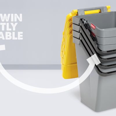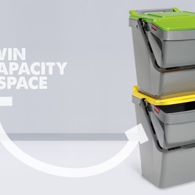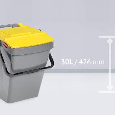 Stapelbarer Recycling-Behälter für die getrennte Abfallsammlung mit rechteckiger Grundfläche, aufklappbarem Deckel mit großer Frontklappe zum einfachen Einwurf von Abfällen, Griff mit Deckelverriegelung und automatischer Öffnung bei Entleerungsvorgängen.