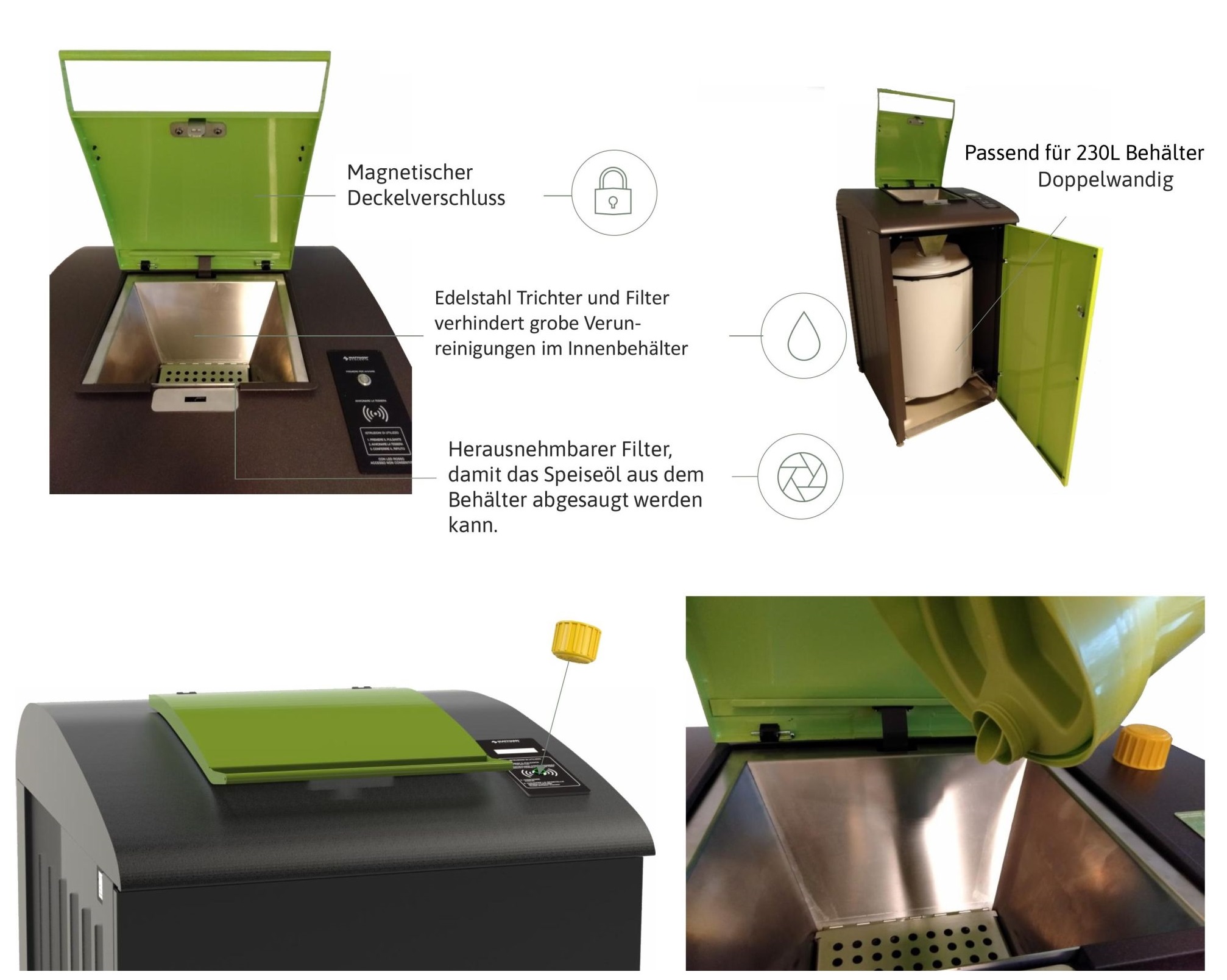 Used cooking oil: down the drain into the sewer? We offer an intelligent collection system for collecting used cooking oil from private households that focuses on maximum logistical efficiency.